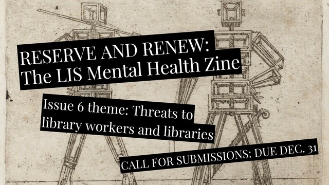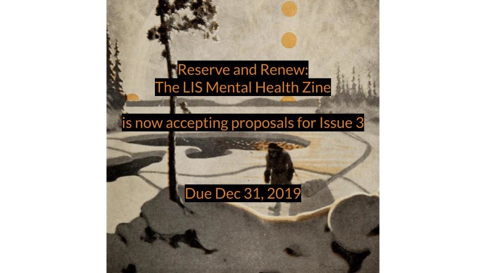 Now accepting submissions for the third issue of "Reserve and Renew," the #LISmentalhealth zine! https://tinyurl.com/reserveandrenew3submissions. We're looking for personal reflections, essays, poetry, comics, drawings, collage, photos, self care tips, etc.! Deadline: Dec 31. #LibraryLife