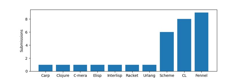 This year's Jam had a record number of submissions made using 9 seperate dialects of lisp / scheme!
