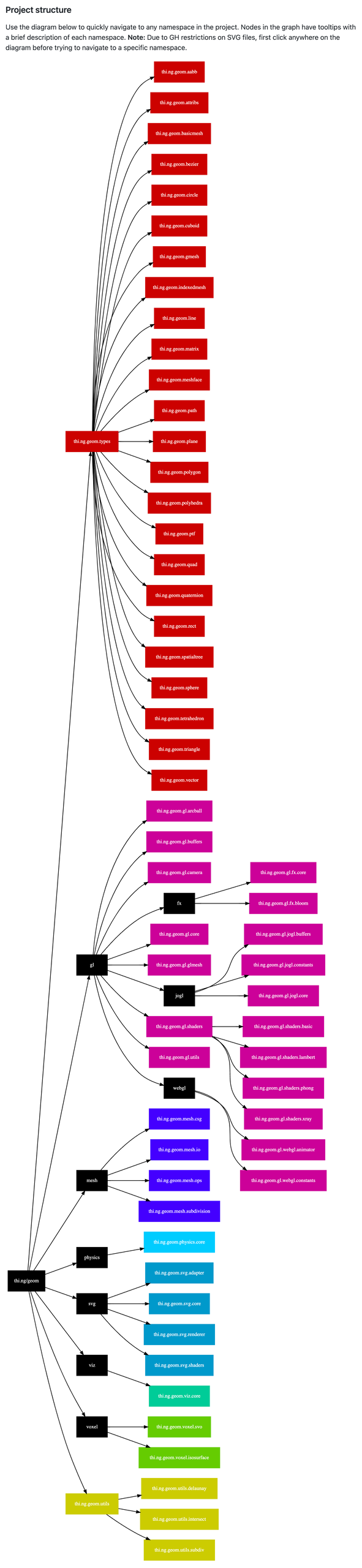 In hindsight, the project, design and learnings from Clojure heavily inspired and directly expanded into my later (current!) #TypeScript work and the group of 20 new libraries under the same name (i.e. see https://thi.ng/geom). The latter is _not_ a direct port and currently still has a much stronger focus on 2D, yet again is one of the largest groups of libraries in the entire https://thi.ng/umbrella monorepo...