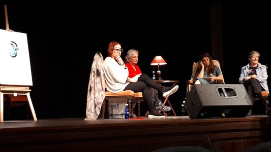 Aurrera doa #Literaturia letren plaza Zarautzen. Irudian Miren Agur Meabe, Arantxa Urretabizkaia eta Laura Mintegi idazleak, Eider Rodriguezen galderak erantzuten @LISIPEsusa@twitter.com