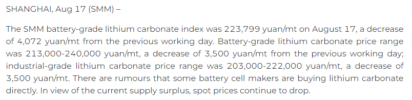 Lithium Carbonate Prices Extend Declines (Aug 17) https://news.metal.com/newscontent/102336215/Lithium-Carbonate-Prices-Extend-Declines-Aug-17 #Litio #Lithium #Bolivia #Argentina #Chile