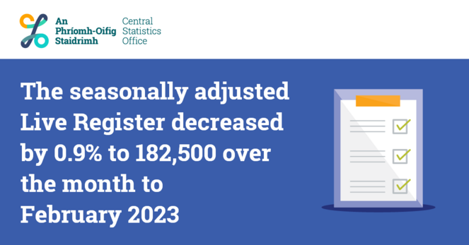 The seasonally adjusted Live Register decreased by 0.9% to 182,500 over the month to February 2023