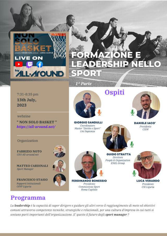 Giovedì 13 luglio, ore 19:30, #livefacebook, #livetwitch e #liveyoutube Non Solo Basket 2ª puntata 2023 che formazione e futuro per i nuovi manager dello sport? Prima parte per affrontare i temi della nuova legge dello sport in vigore dal 1° luglio 2023.