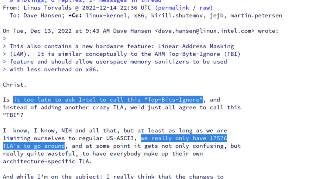 That's a quote from https://lore.kernel.org/all/CAHk-%3Dwi%3DTY3Kte5Z1_nvfcsEh%2Brcz86pYnzeASw%3DpbG9QtpJEQ@mail.gmail.com/T/#u , where he complains about the naming of Intel's Linear Address Masking (LAM) (see: https://lwn.net/Articles/902094/ ) submitted for #Linux #Kernel 6.2 and asks: