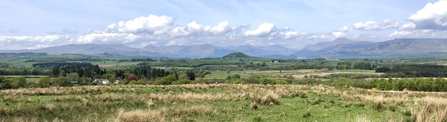 Cracking views N from the northern edge of the Kilpatrick Hills to the mountains ringing Loch Lomond. And the wee Dumpling in front!