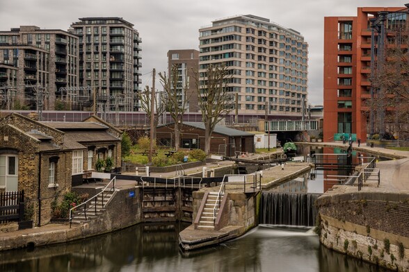 Train (Eurostar?) heading out of Saint Pancras International station, passing the Grand Union Canal, London.