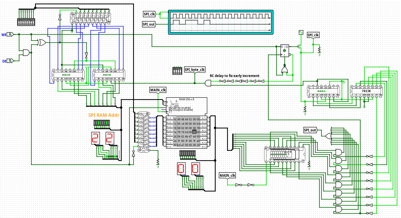 gotta put this down for a bit and move onto some other projects but this has been a super fun exerciser, and aside I'm certain to have some timing debugging to do I think I have a mostly working SPI output driver in #logisim