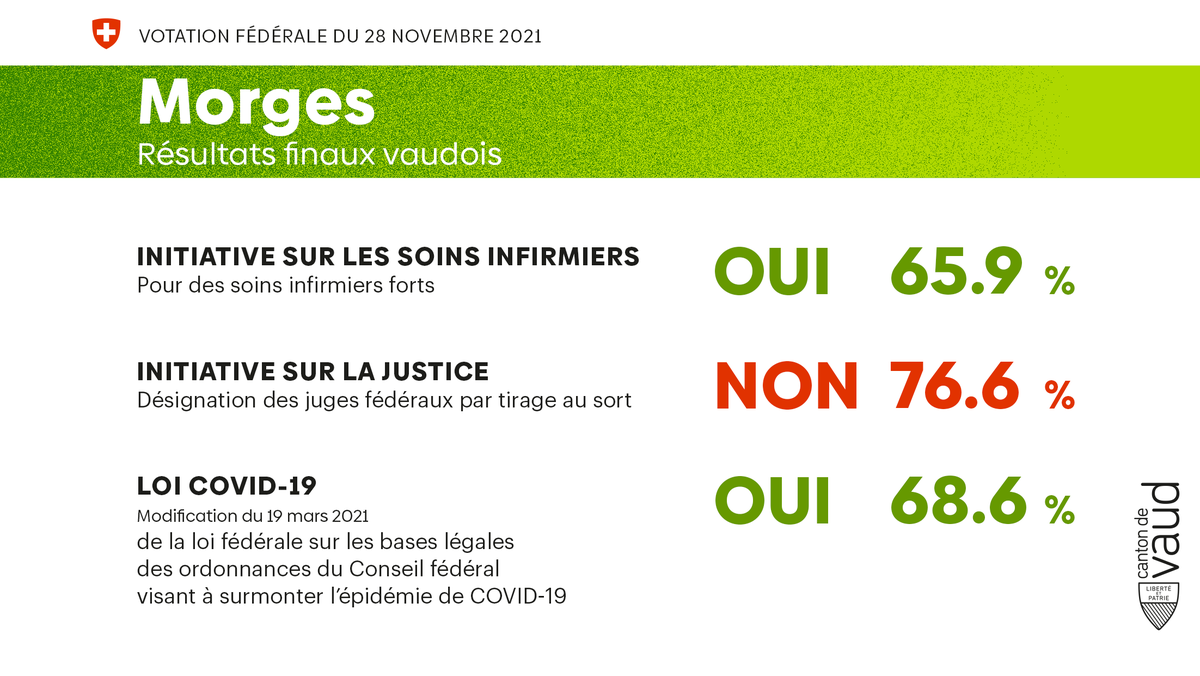 ✔️ OUI 68.6% Modification du 19 mars 2021 sur la loi COVID-19 #LoiCovid Participation 63.2% #Chvote #Vaud @VilledeMorges@twitter.com https://www.elections.vd.ch/votelec/app13/index.html?id=CHVO20211128#v=results&ad=2227&ac=5642&o=2