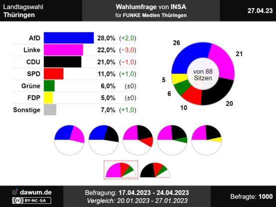 #Wahlumfrage Thüringen, INSA (27.04.23): AfD: 28% (+2), Linke: 22% (−3), CDU: 21% (−1), SPD: 11% (+1), Grüne: 6%, FDP: 5%, Sonstige: 7% (+1) ➤ https://dawum.de/Thueringen/INSA/2023-04-27/ | #Sonntagsfrage #ltwth