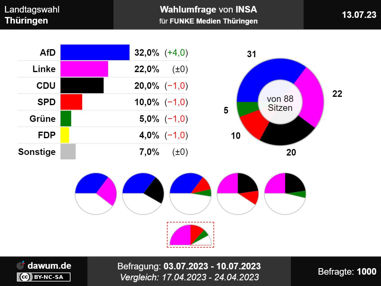 #Wahlumfrage Thüringen, INSA (13.07.23): AfD: 32% (+4), Linke: 22%, CDU: 20% (−1), SPD: 10% (−1), Grüne: 5% (−1), FDP: 4% (−1), Sonstige: 7% ➤ https://dawum.de/Thueringen/INSA/2023-07-13/ | #Sonntagsfrage #ltwth