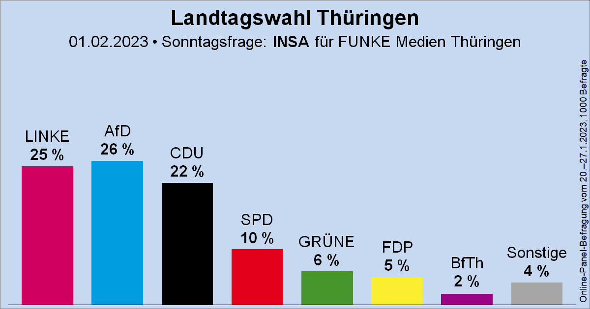 Sonntagsfrage zur Landtagswahl in Thüringen (#ltwth) • INSA / FUNKE Medien Thüringen: AfD 26 % | DIE LINKE 25 % | CDU 22 % | SPD 10 % | GRÜNE 6 % | FDP 5 % | Bürger für Thüringen (BfTh…