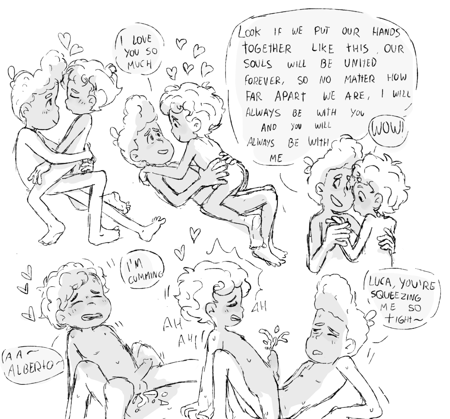 In this picture, both Luca and Alberto are loosing their virginity together and Alberto admits he doesn't know what he is doing but he and luca can figure out what feels good ans go accordingly while Luca tells Berto to be careful and not go too hard.