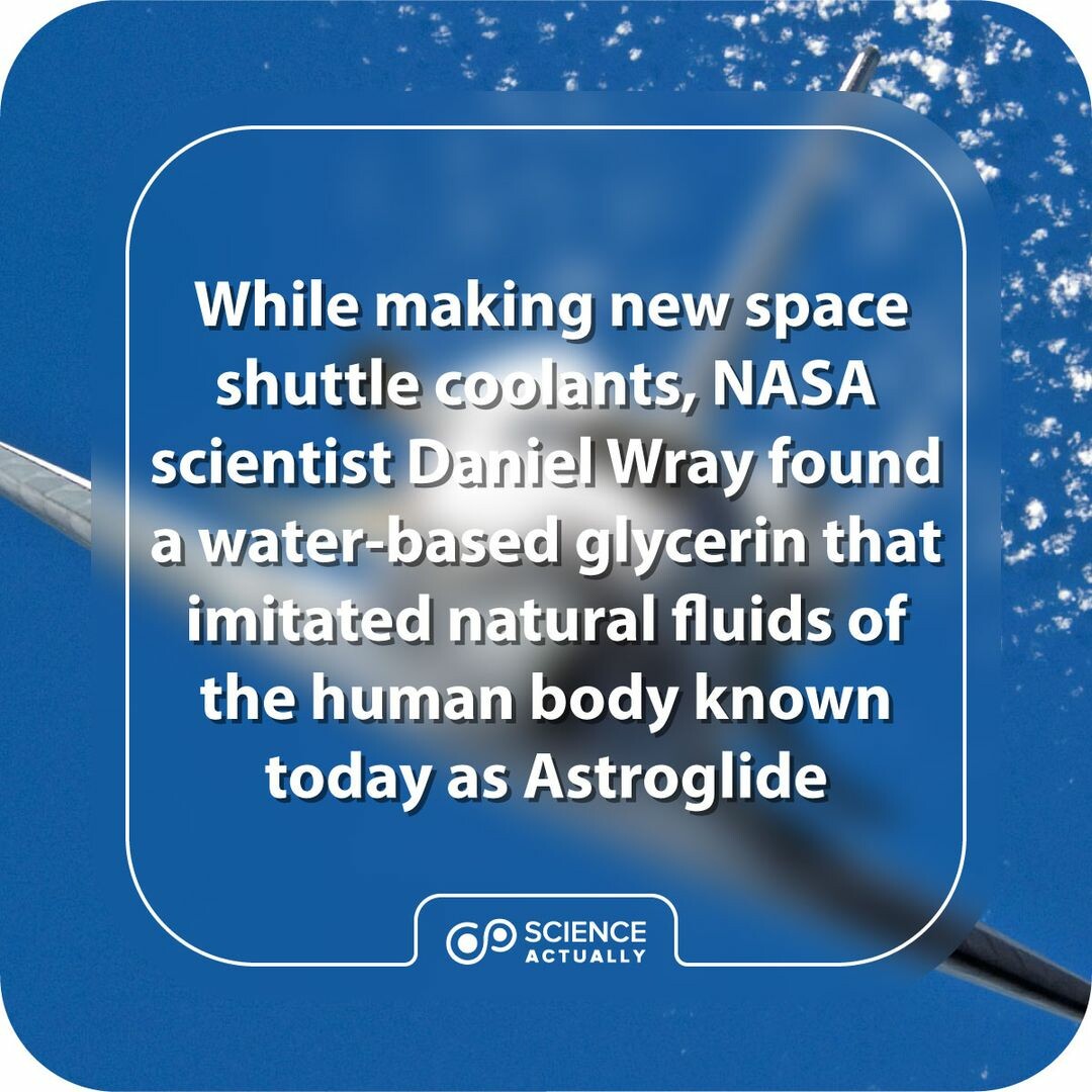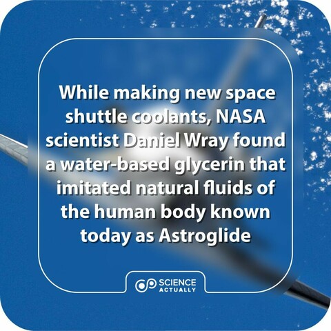 While making new space shuttle coolants, NASA scientist Daniel Wray found a water-based glycerin that imitated natural fluids of the human body - known today as Astroglide.