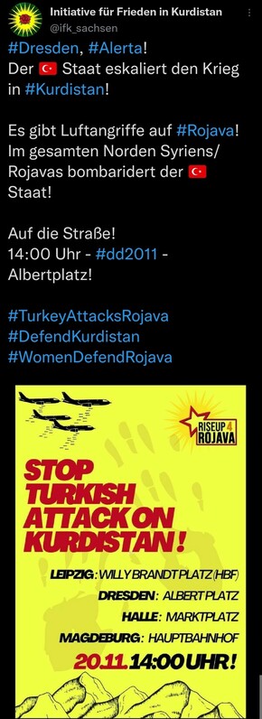 Anlässlich der aktuell anhaltenden #Luftangriffe der #Türkei auf Gebiet in #Kurdistan, kommt es heute in mehreren Städten zu #Solidaritätskundgebungen, so auch in #Dresden. #DD2011