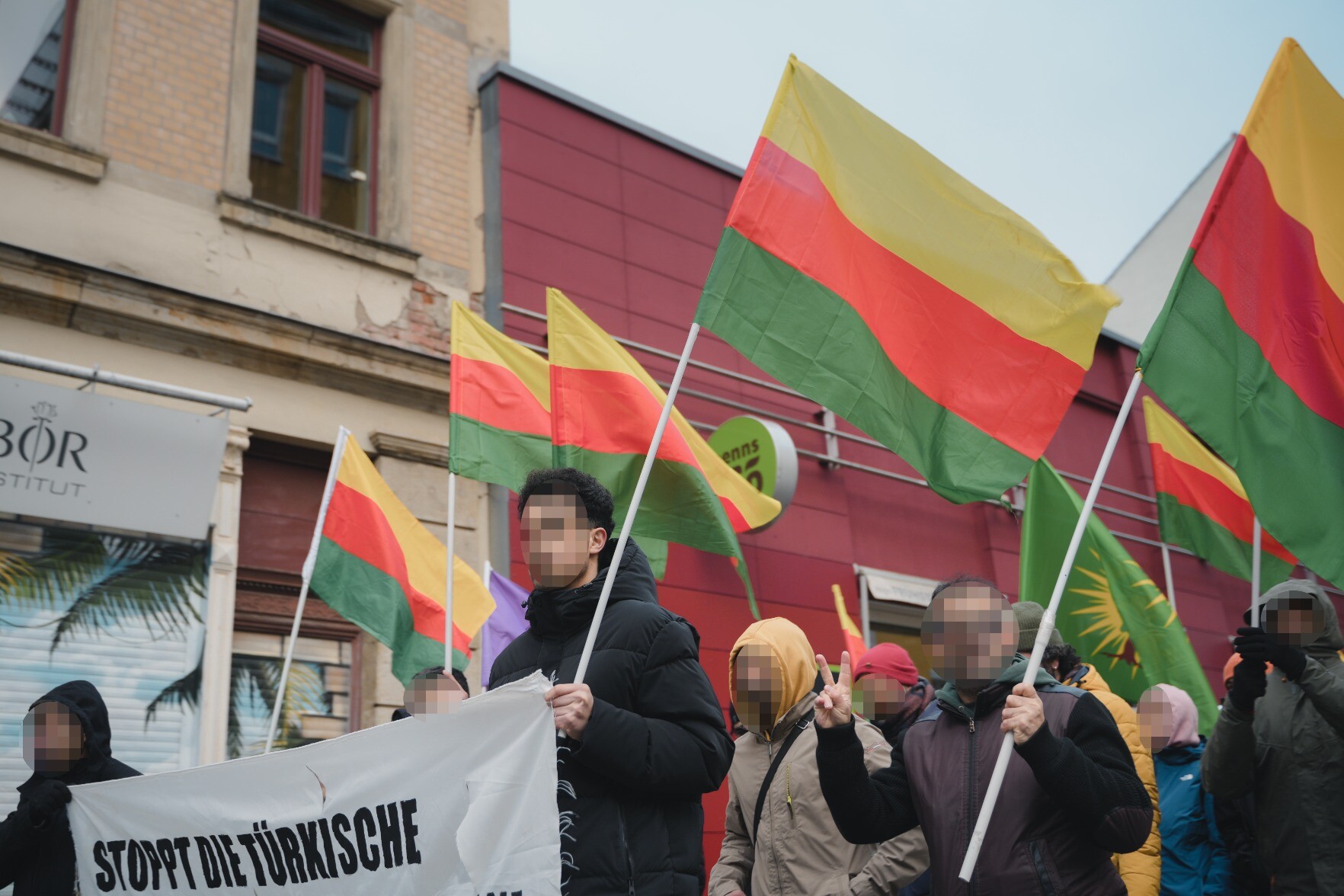 Mit rot-gelb-grünen #Rojava-Fahnen gingen heute bis zu 100 Personen in #Dresden auf die Straße, um gegen die türkischen #Luftangriffe auf #Kurdistan zu demonstrieren. Bundesweit fanden heute mehrere spontane Demonstrationen in Solidarität mit den Betroffenen statt. #dd2011
