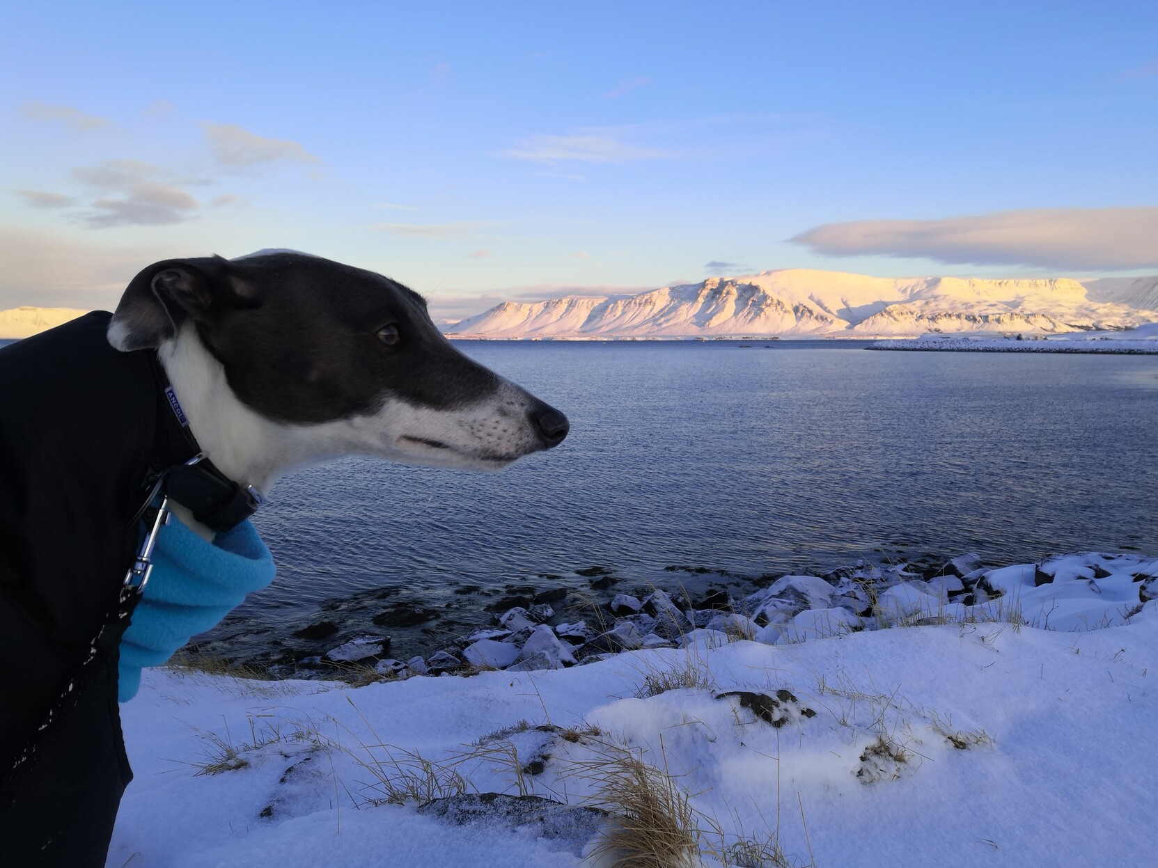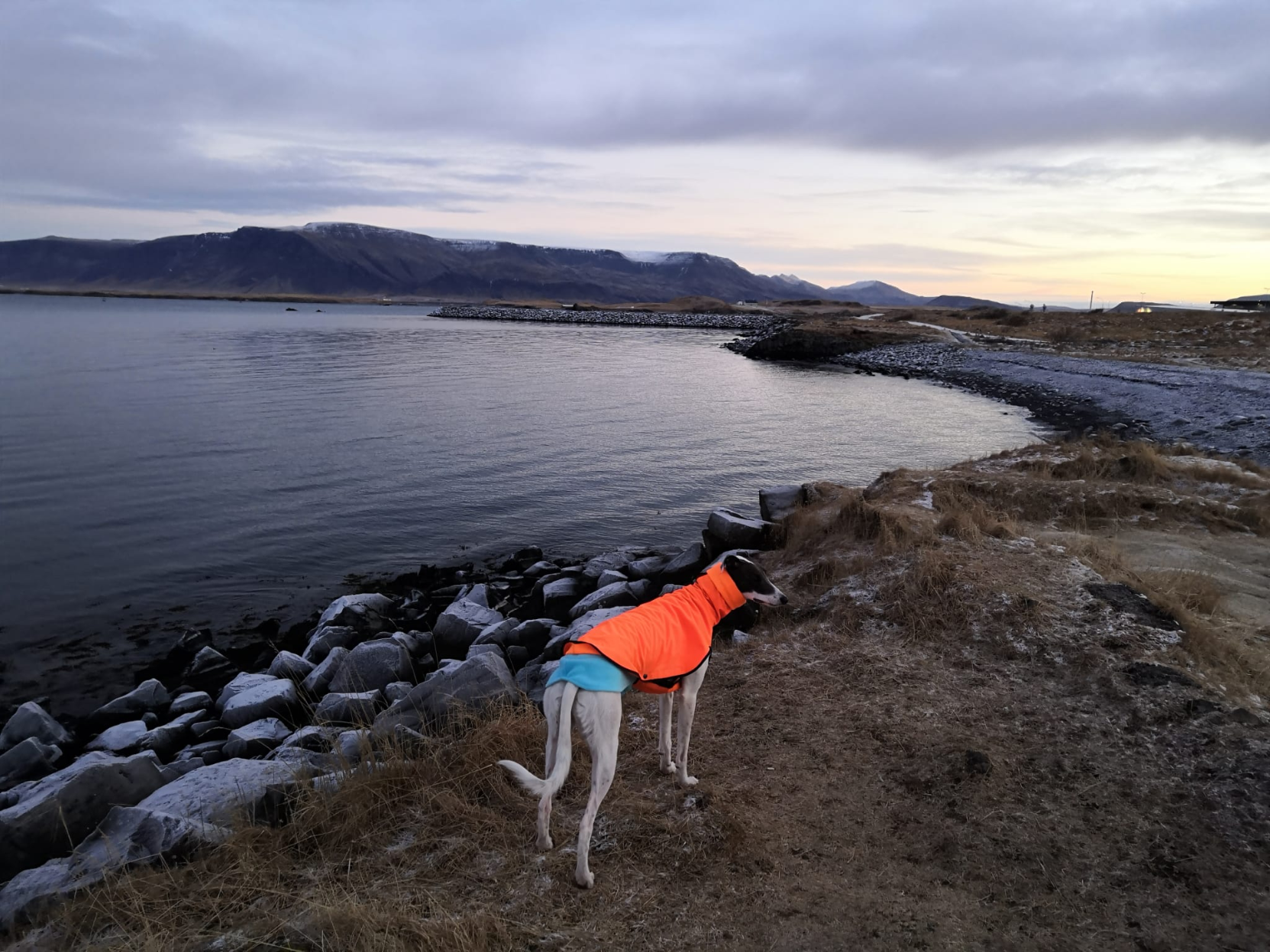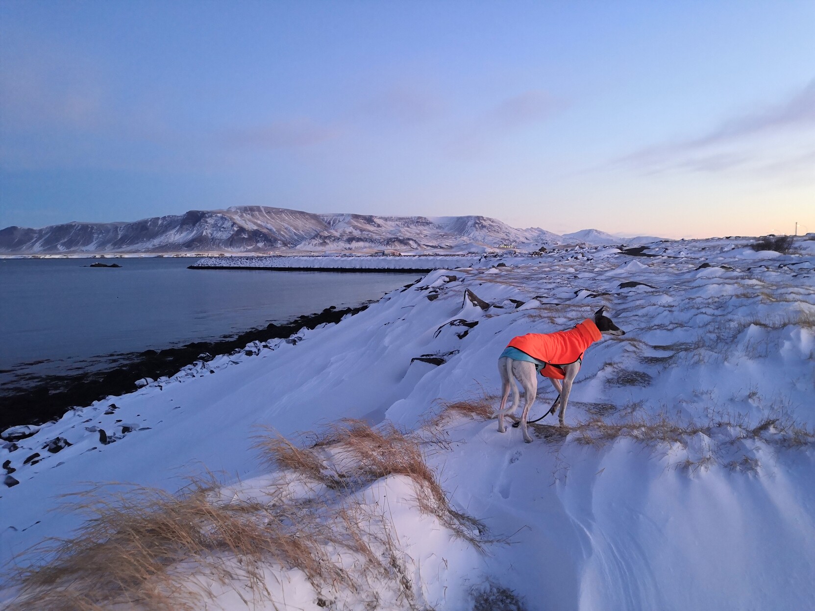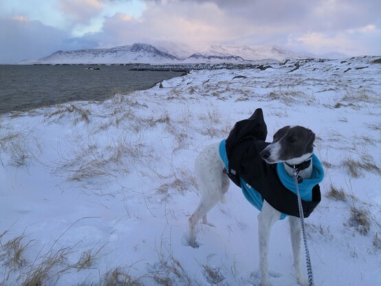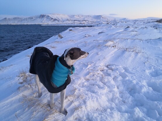 Just about bright by 11 at Laugarnestangi. Definitely two-coat weather! #dogsofmastodon #lurchersofmastodon