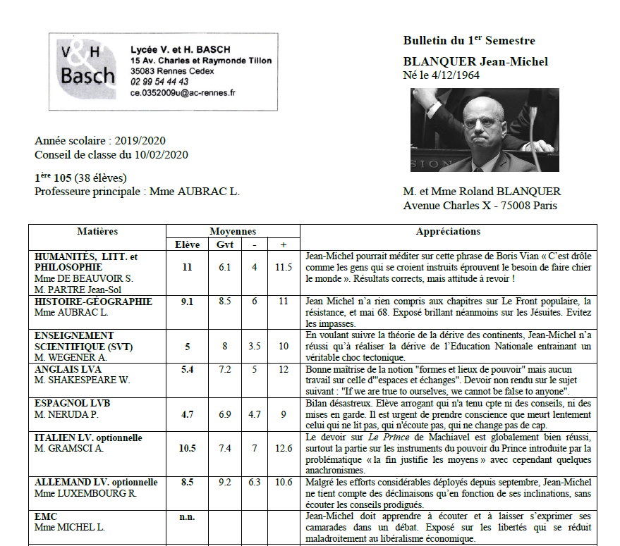 Le bulletin de l'élève J-M Blanquer, par les professeur-es du lycée VHB à #Rennes :