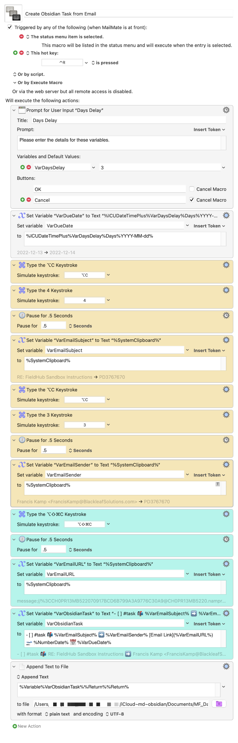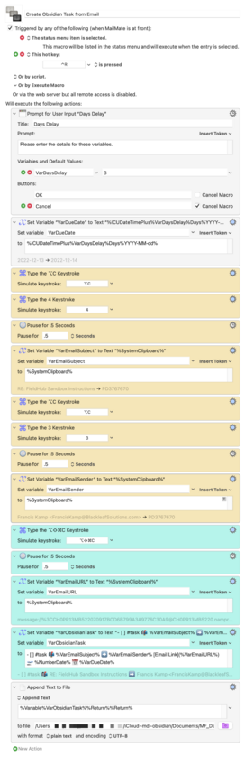 Just started the #KeyboardMaestro free trial and immediately bought it when I figured out I could create a macro in #MailMate to automatically create a task in #ObsidianMD from an email message.
