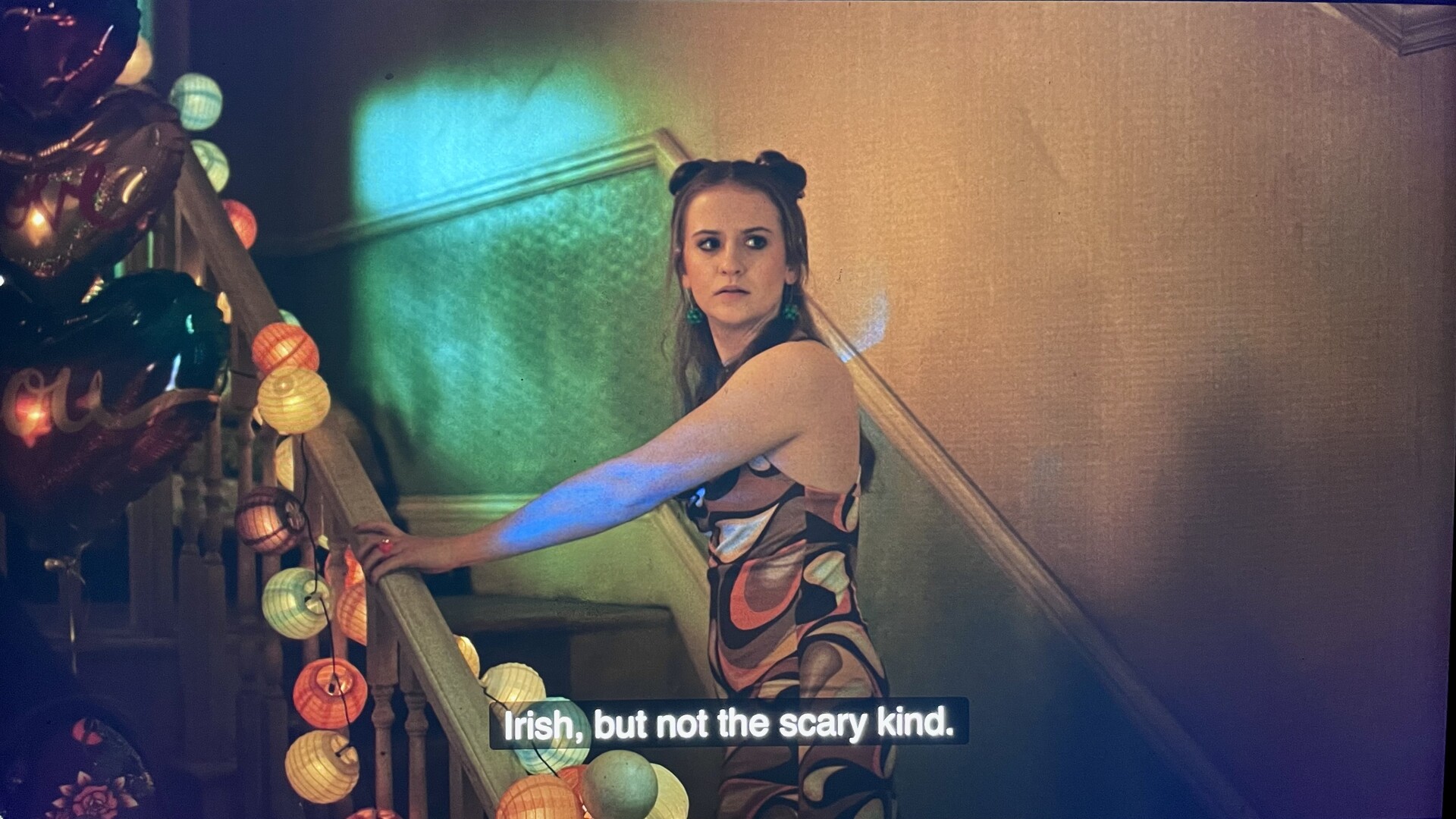 Image Description: ‘Extraordinary’ still of Jen in a party dress, going up a stairs which is festooned in mini-lanterns, looking back over her shoulder. Sub-titles read: Irish, but not the scary kind.