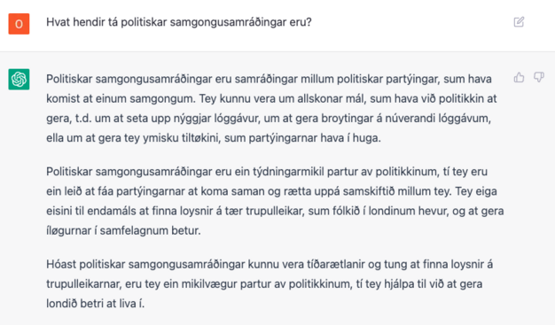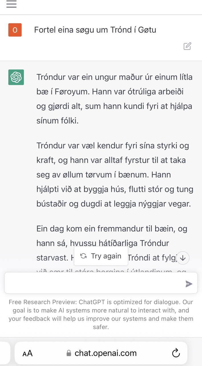 Tað er nokk stuttligt at fáa ChatGPT at svara føroyskum spurningum á føroyskum, tó at tað mesta er mjørkatos og møsn.