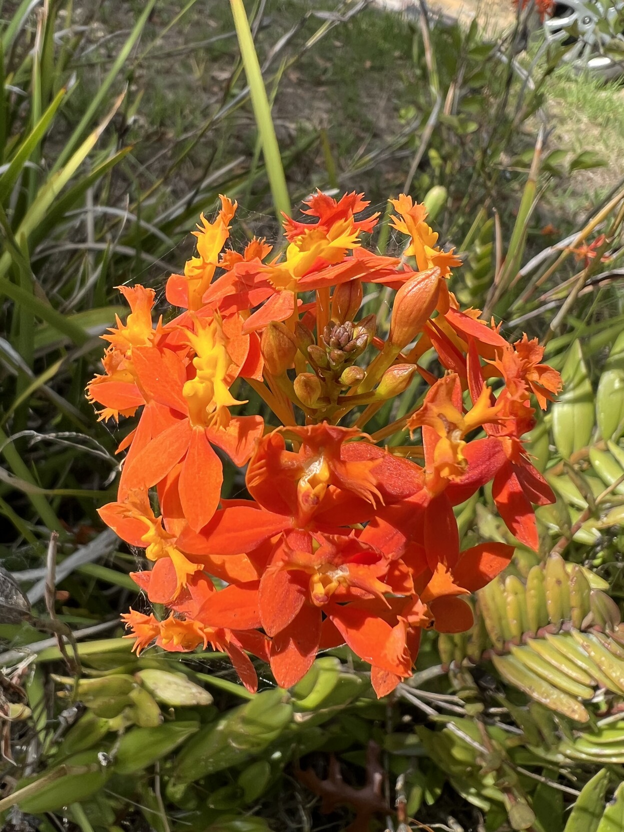 It is a Epidendrum radicans; common names include ground-rooting epidendrum, fire-star orchid, rainbow orchid, and reed-stem epidendrum.