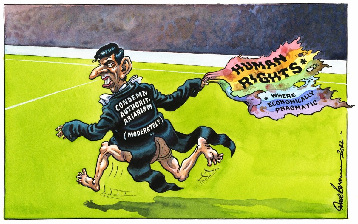 Dave Brown on #RishiSunak #MansionHouseSpeech #HumanRights #China #Iran #Russia #Qatar #FIFAWorldCupΒ - political cartoon gallery in London http://original-political-cartoon.com