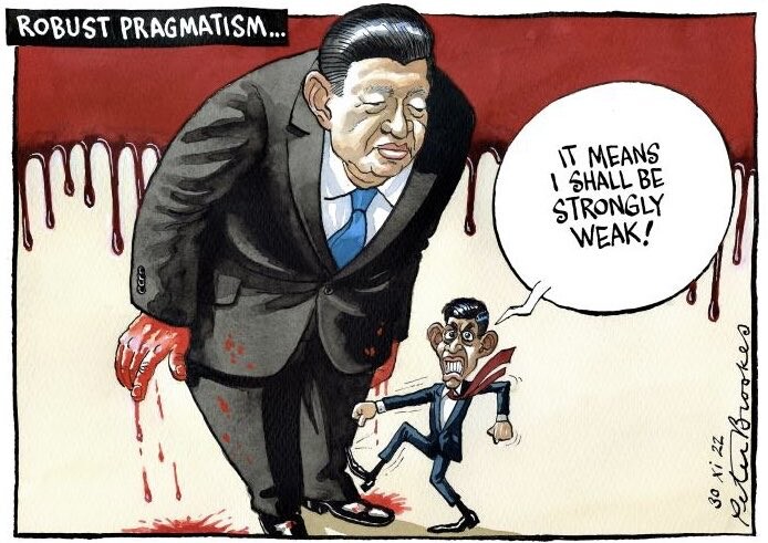 Peter Brookes on #RishiSunak #MansionHouseSpeech #HumanRights #China - political cartoon gallery in London http://original-political-cartoon.com