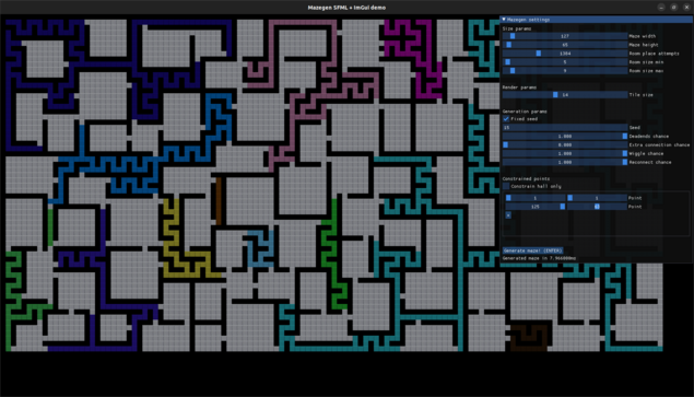 Check out this C++ header-only maze generation lib by baz_a: https://old.reddit.com/r/roguelikedev/comments/11bpnfl/ive_made_a_c_headeronly_maze_generation_library/j9z2rcd/