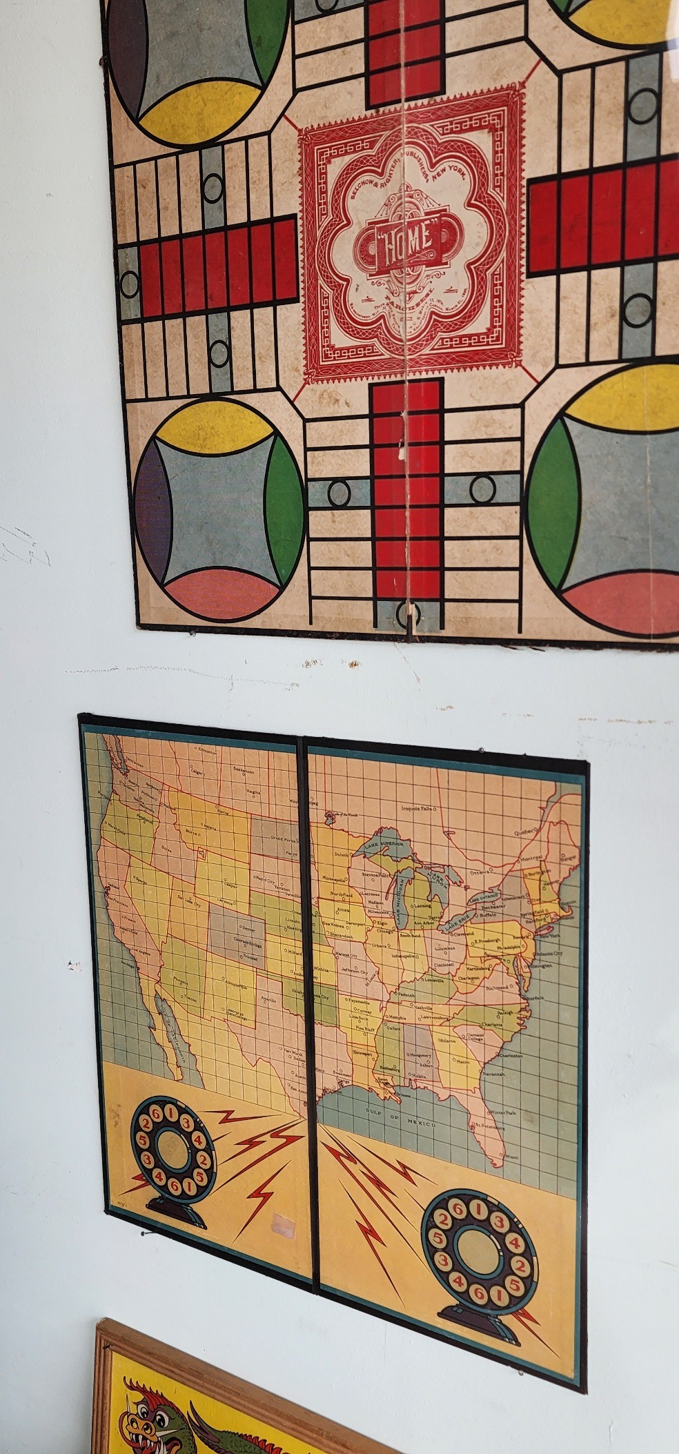 Antiques store game board and globes windiw display. Maps in the wild harmonic convergence