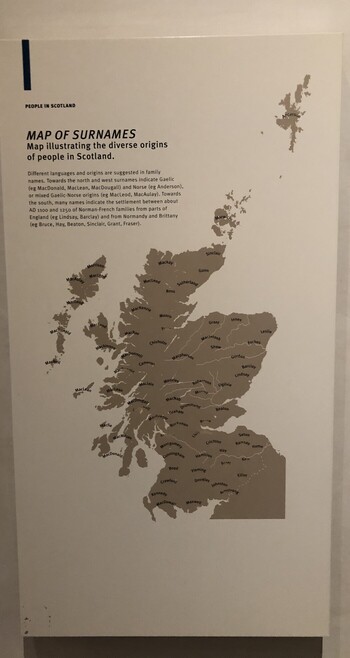 At the National Museum of Scotland I spotted this map of place names categorised by the origins of the early dwellers and a map showing the geographic incidence of surnames which may well be coneected to the place names.