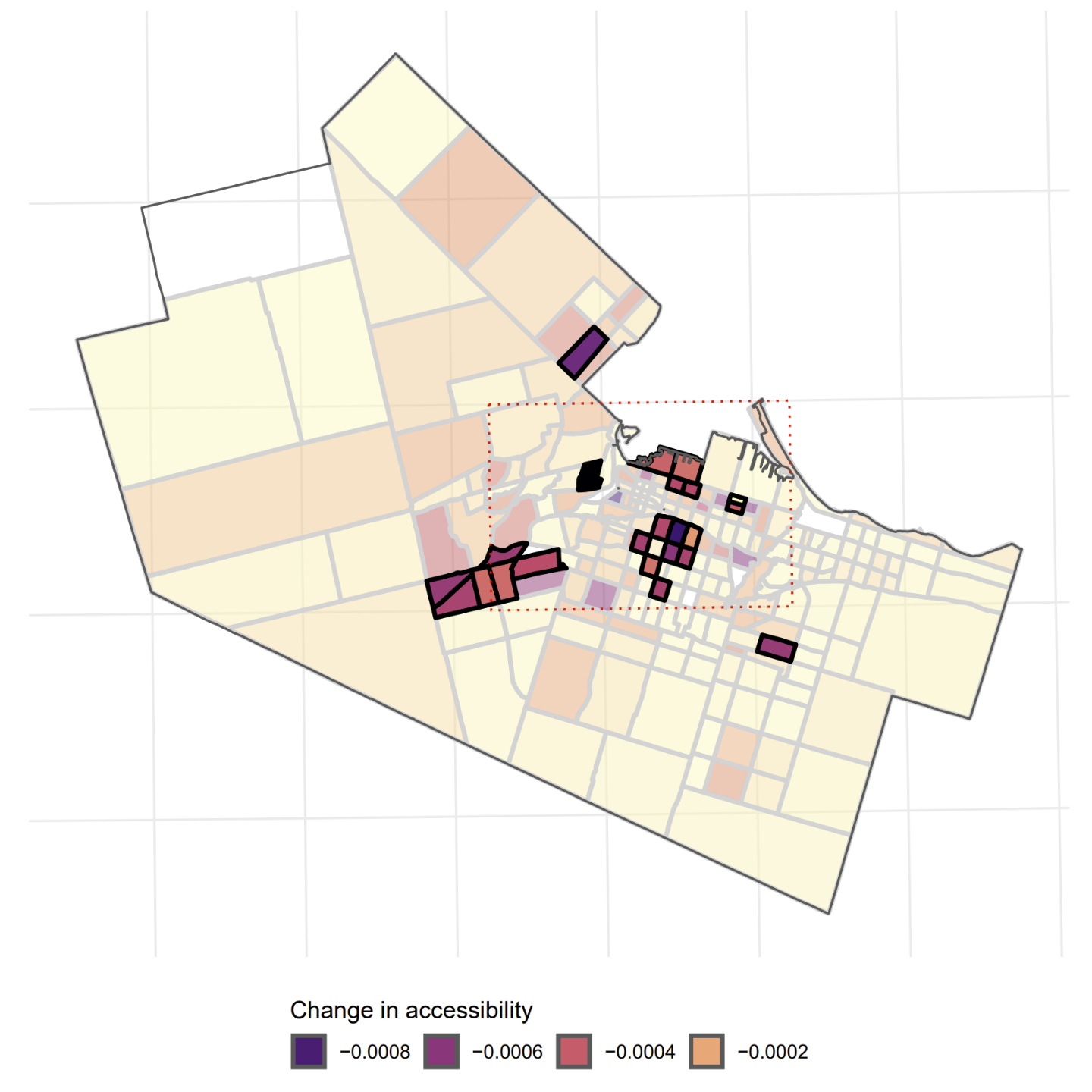 The closure of facilities during the pandemic led to overall decreases in accessibility, but the losses were worse in relatively deprived central parts of the city, as well as more peripheral regions.