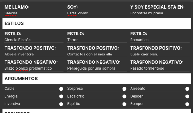Lo que posteo es un personaje de ejemplo que he hecho en un rato. Como se vé, en el sistema que ando testeando va todo con aspectos de palabras y frases.