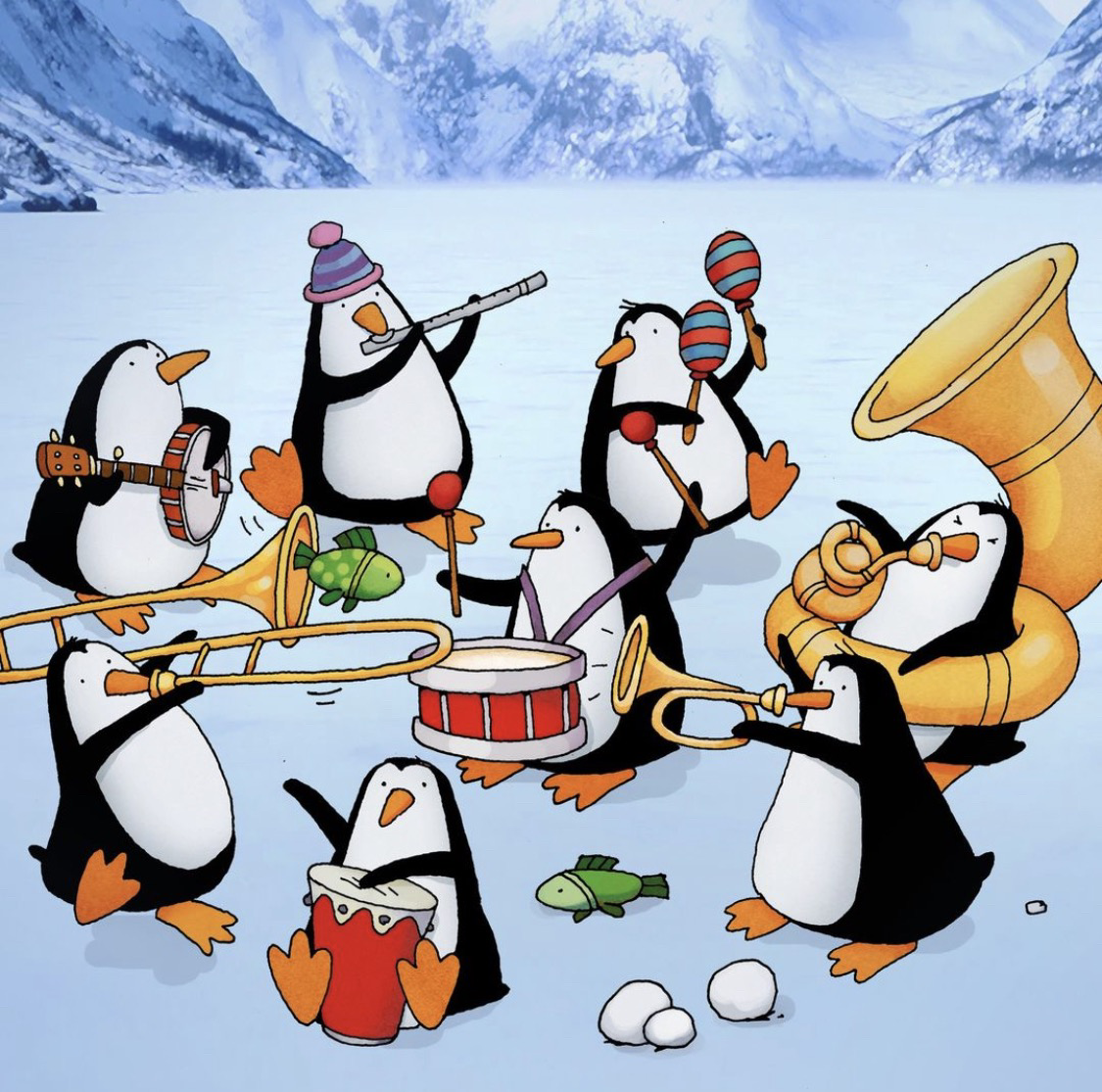 #penguin #band #banjo #flute #maracas #sousaphone #Bugle #drum #trombone #conga #fish #antarctica #jam #illustration #kidlit #worldpenguinday #mastoart