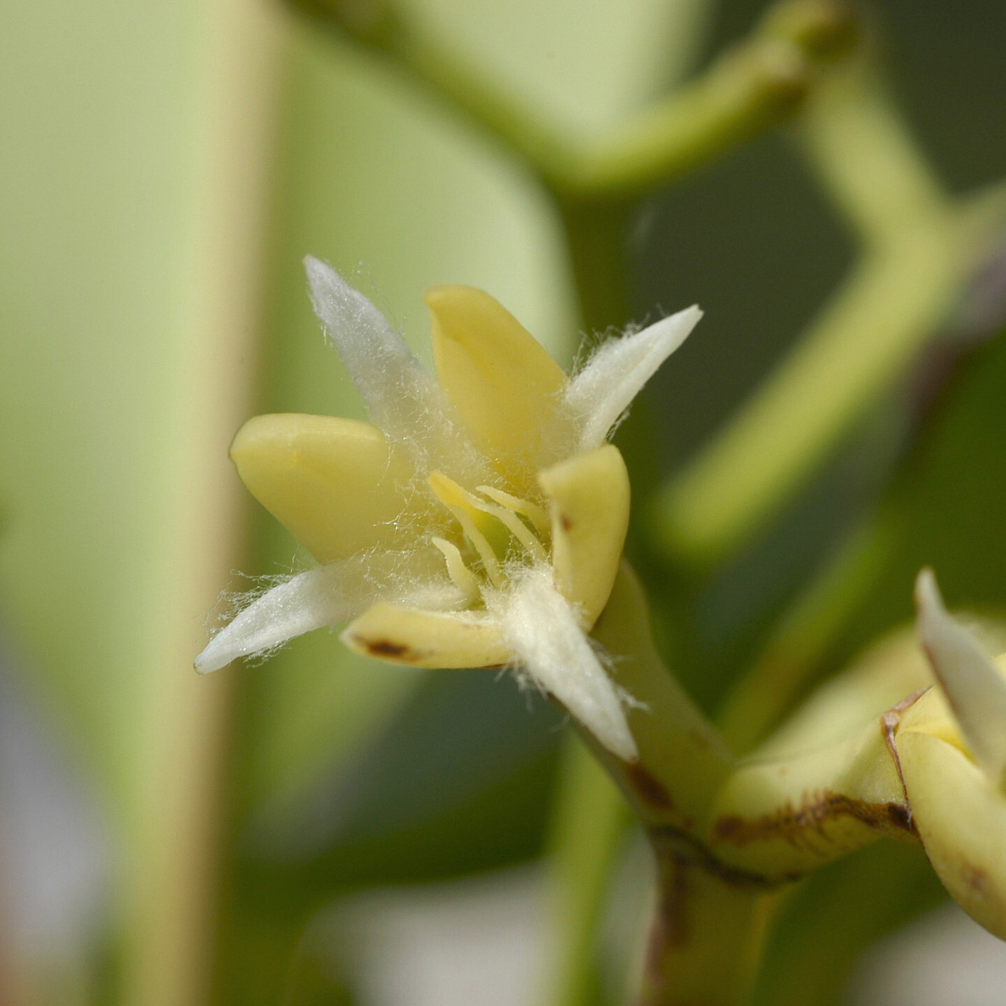 Yet another tree found in the Amazon coast mangrove forests: Rhizophora racemosa G.Mey. occurs where the influence of river water dominates, e. g., along the shores of Marajó Bay. In contrast to the similar, more common R. mangle, inflorescences axes show several levels of ramification (vs. 1-2), the flower buds are oval (not pointy), fruits are rather pear- (not cone-)shaped and the propagules they develop are much longer.