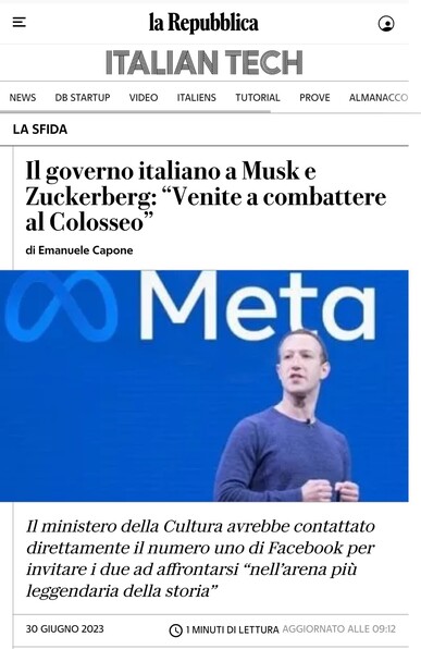 Italian right wing Minister of culture just offered #elonmusk and #markzuckenberg to have their fight in #Rome at Colosseum. I might go back to sleep.