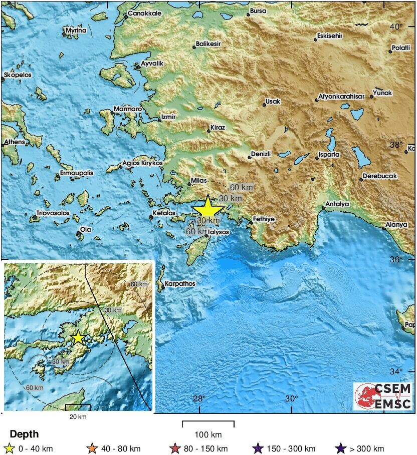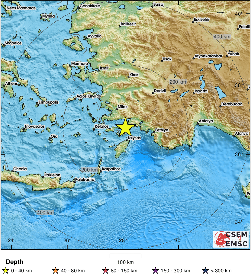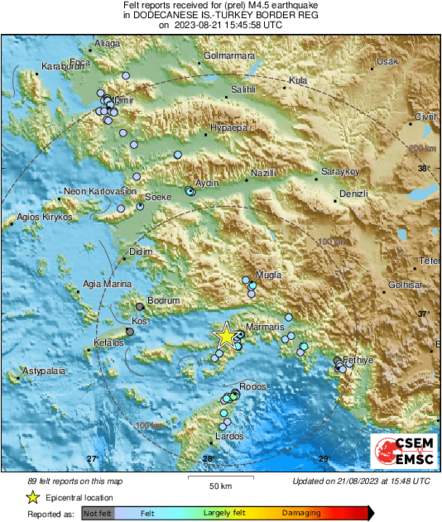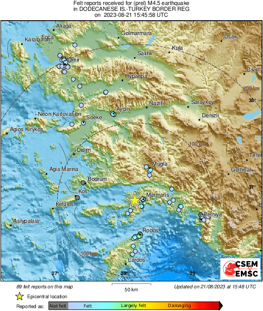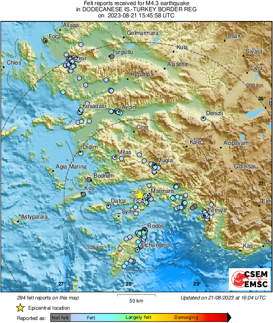 ℹEvent wrap-up: today a M4.3 #earthquake (#deprem) hit #Marmaris (#Turkey) at 18:45:58 local time (UTC 15:45:58). Shaking was felt over 200km by approximately 1M people in Turkey and Greece.