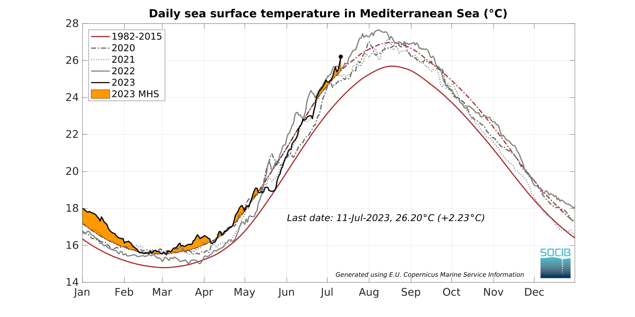 La temperatura superficial del #MarMediterráneo comienza a despuntar peligrosamente. Estas anomalías son mucho más acusadas en las aguas del oeste (entre 3 y 5ºC por encima del promedio). En esta región la subida es de alrededor de 0,05ºC/año, aunque la verdadera aceleración se está produciendo ahora.