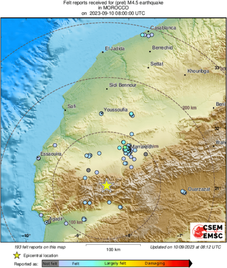 🔔#Earthquake (#زلزال) M4.5 occurred 77 km SW of #Marrakech (#Morocco) 28 min ago (local time 09:00:00). More info at: