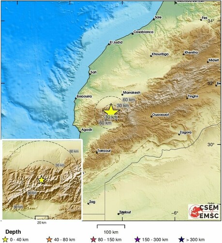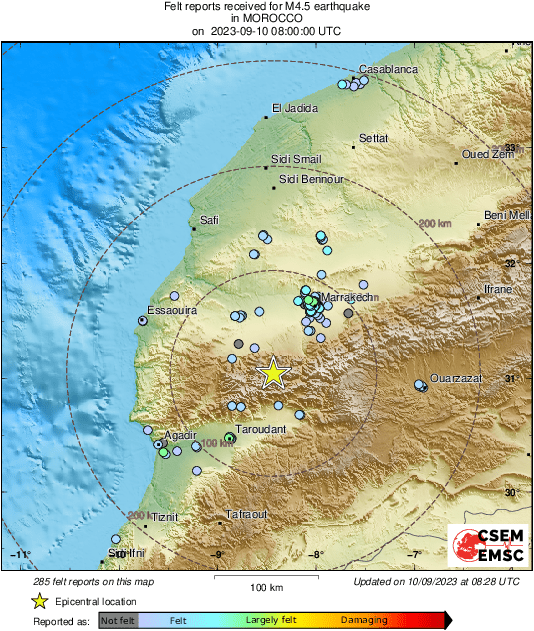 #Earthquake 77 km SW of #Marrakech (#Morocco) 28 min ago (local time 09:00:00). Updated map - Colored dots represent local shaking & damage level reported by eyewitnesses. Share your experience: