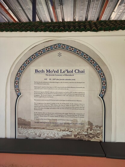 Wir waren heute auch im jüdischen Stadtteil in #Marrakesch unterwegs. Auf dem jüdischen Friedhof dort habe ich keine Bilder von Gräber gemacht, denn sowas mache ich nicht. Von 2 Schilder am Eingang schon und ich habe ein Bild von einer Ausstellung dort gemacht (wo allerdings auch alte Gräber drauf zu sehen sind). #Marokko