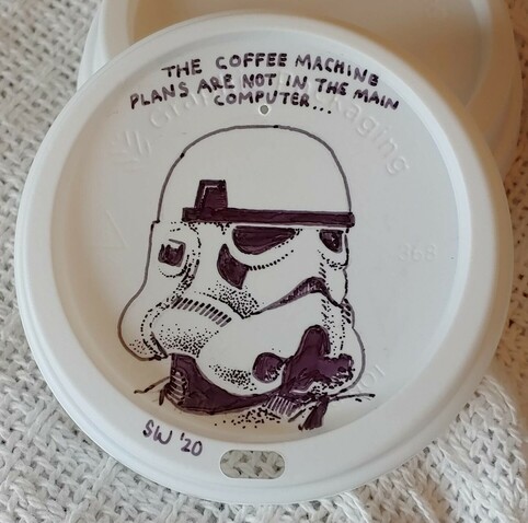Here's an old coffee cup lid drawing from 2020 to wake up to. #coffee #ink #drawing #StarWars #Stormtrooper #mastoartc