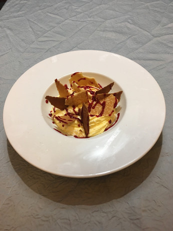 Mousse légère fruit de la passion, coeur clémentine au Napoléon, #biscuit cuillère et craquant