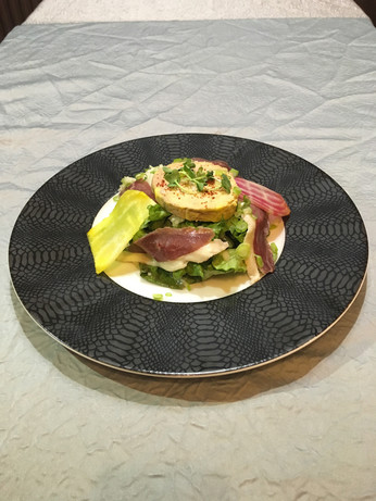 Salade de L'Arôme, foie gras de canard maison , magret de canard fumé et vinaigrette à la pomme Granny Smith