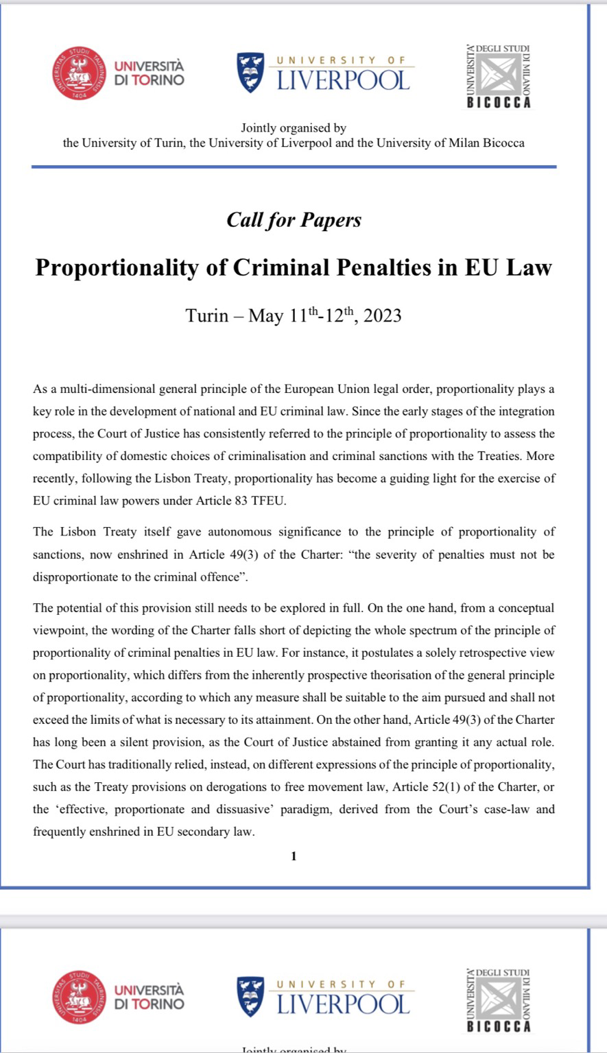 Call for Papers “Proportionality of Criminal Penalties in EU Law”, Turin – May 11th-12th, 2023 https://www.aisdue.eu/call-for-papers-proportionality-of-criminal-penalties-in-eu-law-turin-may-11th-12th-2023/ #cfp #callforpapers #academic #mastodonresearcher #academicmastodon #law