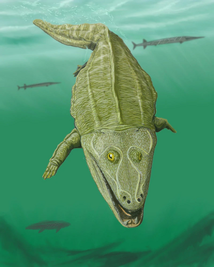 Mastodonsaurus's giant head and its upwards-facing eyes suggest that it spent its life underwater. In addition, #fossils have been found grouped in a way that suggests they died together as their ponds dried out.