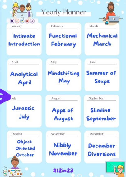 Weirdly enough I can't find anyone in the #mastoverse tooting about #12in23, so I'm the first. Heard about it couple of days ago and today a coworker suggested a study group at work. Goal: Do at least 5 exercises in a language you always wanted to learn, but never did. Go nuts with the language, choose something esoteric, old, new, low level, high level, etc. Each month get's a theme to inspire you, and if you manage all 12 months you might win a hoody. Anyone else planning to participate?