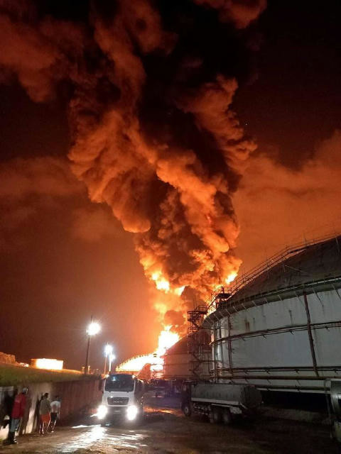 #Cuba 🇨🇺| Imágenes nocturnas desde #Matanzas... Se pone en peligro el tercer tanque de combustible al aumentar el viento .🇨🇺🇨🇺🇨🇺