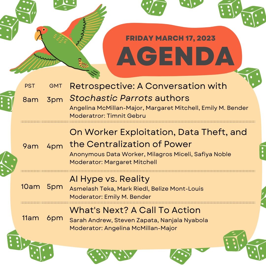 Since we published the #StochasticParrots paper two years ago, the issues discussed in it have only become more urgent and salient. Join me, @timnitGebru @meg Angelina McMillan-Major and an esteemed group of panelists for discussion and reflection, March 17 2023.