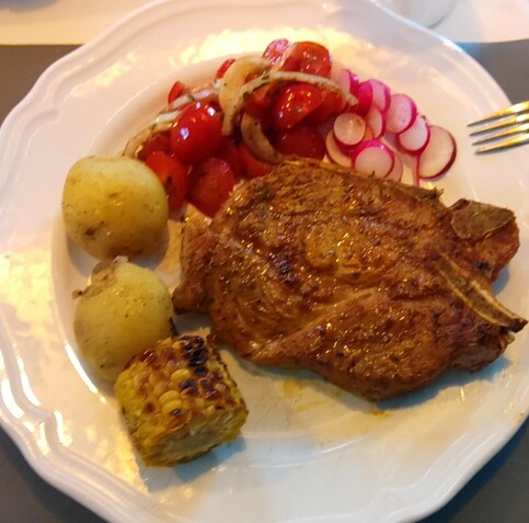 Hva skal man si. Det ble absolutt innafor, dette. Brovold *leker* ikke nakkekotelett.. attåt ble det potet som ble "bakt" på grillen, grillet mais, tomatsalat med balsamico og reddik fra hagen. Omnom!