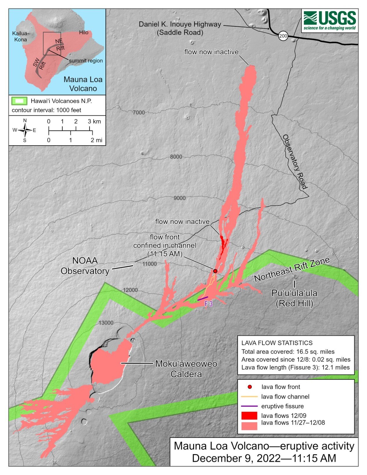 "December 9 #MaunaLoa eruption map shows the short distance lava is traveling out of the fissure 3 vent. Lava flows only made it ~ 1 mi (2 km) down the channel. The flow that made it to 10,000 ft on Dec 8 was inactive when #HVO crew visited yesterday."